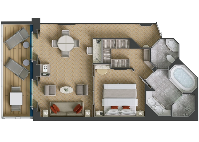 | SV - Superior Veranda Suite 30 m² + balkón 6 m². 7,8,9. paluba. Max 3 osoby. | 12 300 € 12 300 € za osobu |