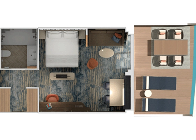 HU - Suite Havana Cabana Corner 33 m² + vonkajšie rohové patio 15 m². 8. paluba vpredu. Max 3 osoby. Tropický štýl, vstup do exkluzívnej zóny Havana. Výhody Suite. 4 444 € 2 222 € za osobu