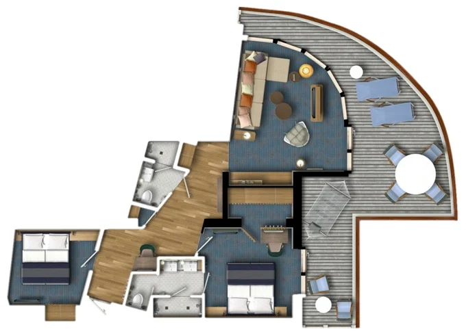 SPNO - Panorama Suite 73-77 m² + balkón 31-36 m² so stolom, ležadlami a hojdacou sieťou. 2 spálne a 2 kúpeľne. 6,9,10. paluba. Max 6 osoby. Výhody Suite. 20 985 € 4 197 € za osobu