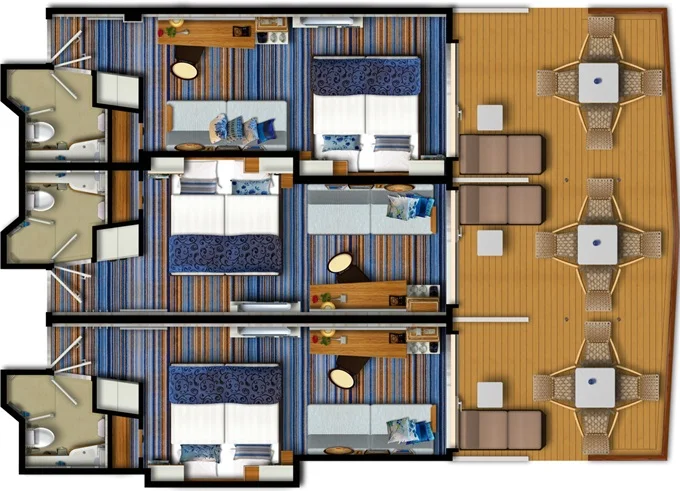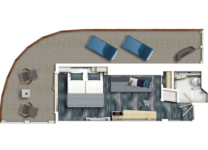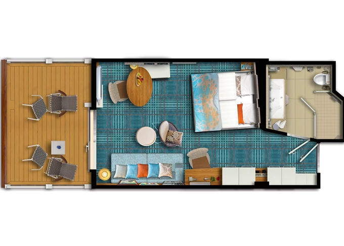 VEPO - Kajuta s terasou Premium 17 m² + balkón 30 m² s hojdacou sieťou a ležadlami. 7-11. paluba. Max 3 osoby. 7 938 € 3 969 € za osobu